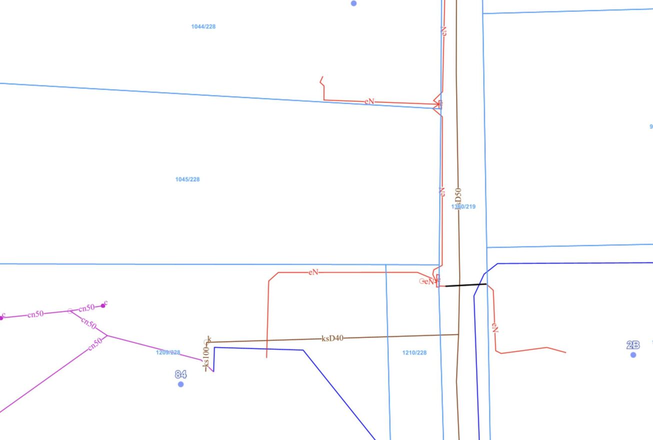 Media: woda i kanalizacja miejska w drodze, skrzynka prądowa na działce